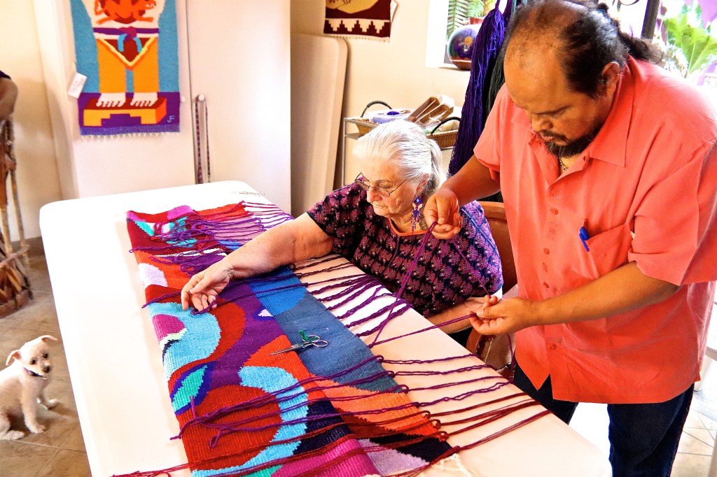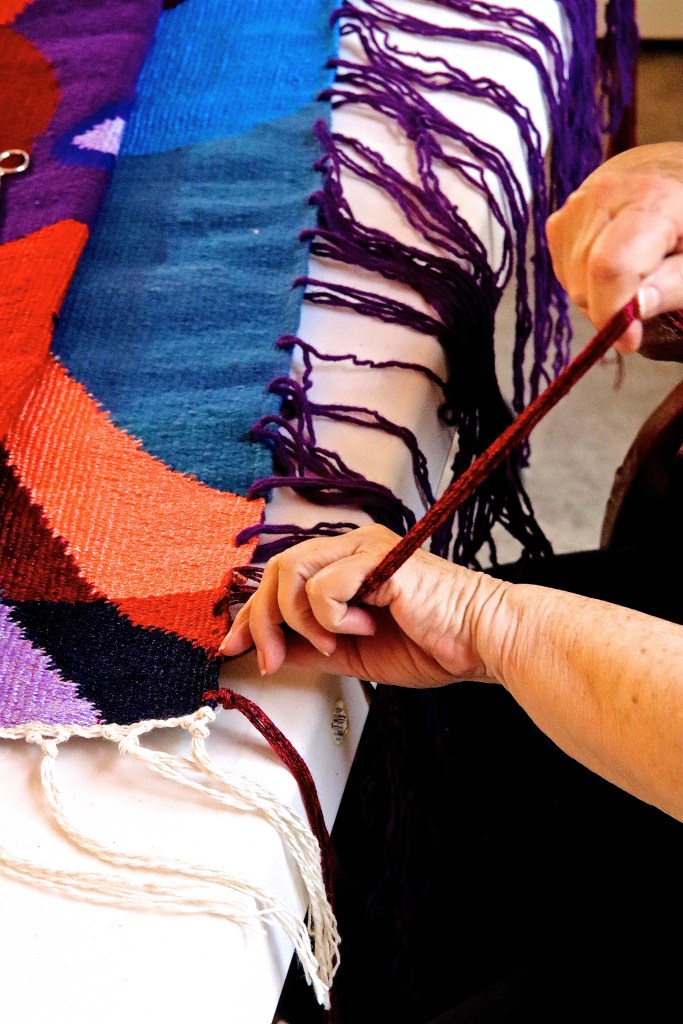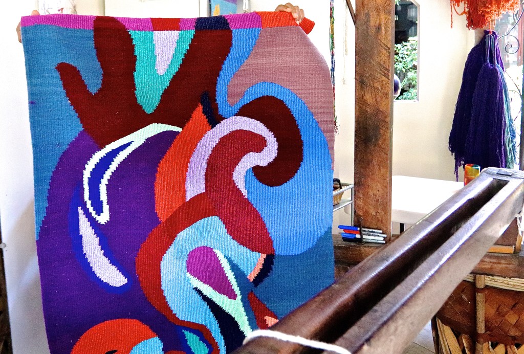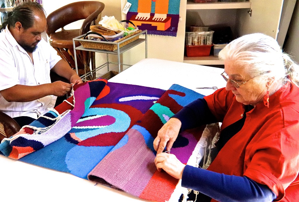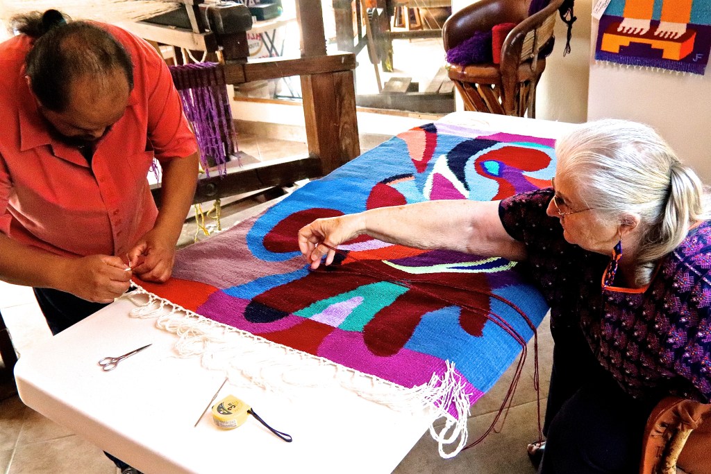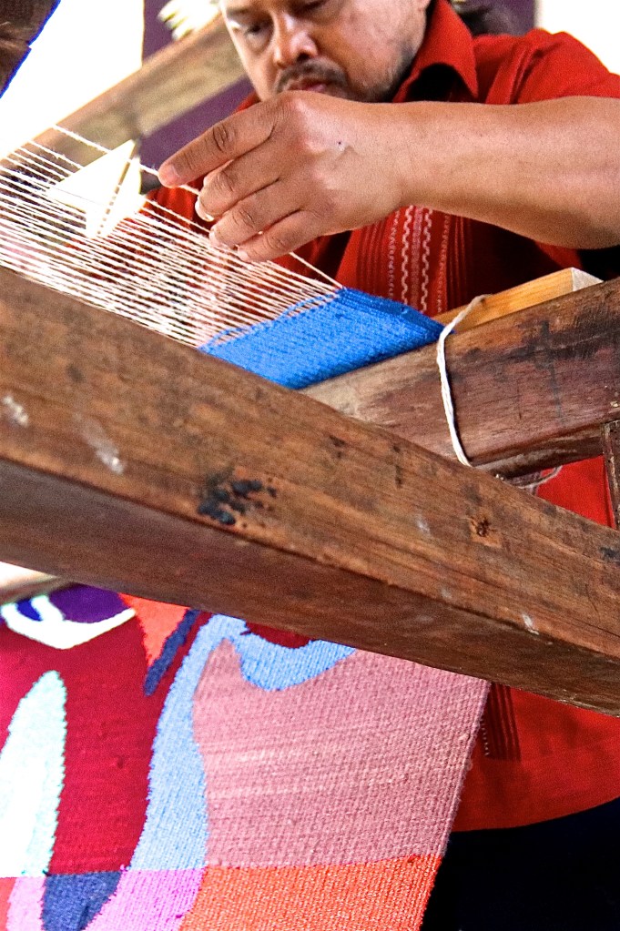 Janice Kimball, accomplished abstract artist, and Francisco Urzua, master Mexican weaver, are a very unusual team. I have felt privileged to be in their presence photographing while they co-create what could be the beginning of a New Wave in Mexican weaving. The fact that Francisco can turn Janice’s very non-traditional, free-form designs into stunning works of abstract fabric art on ancient looms confounds me. Watching him is akin to hearing a very talented jazz musician transform a traditional melody into something familiar and yet utterly new. They are masters of rhythm, in execution and visual results, collaborating at a level at which they become one creator.