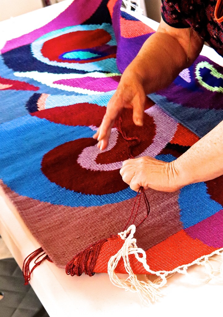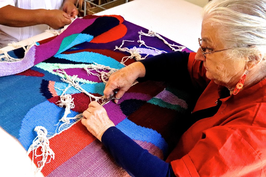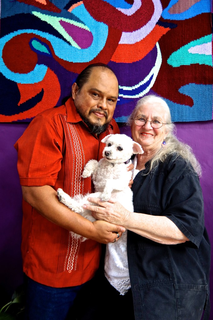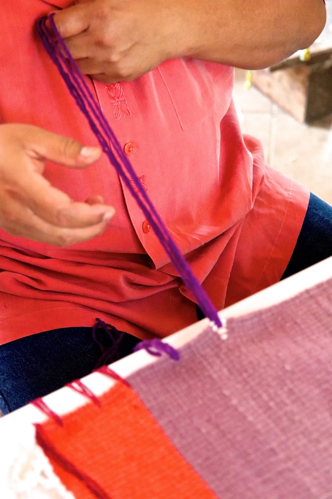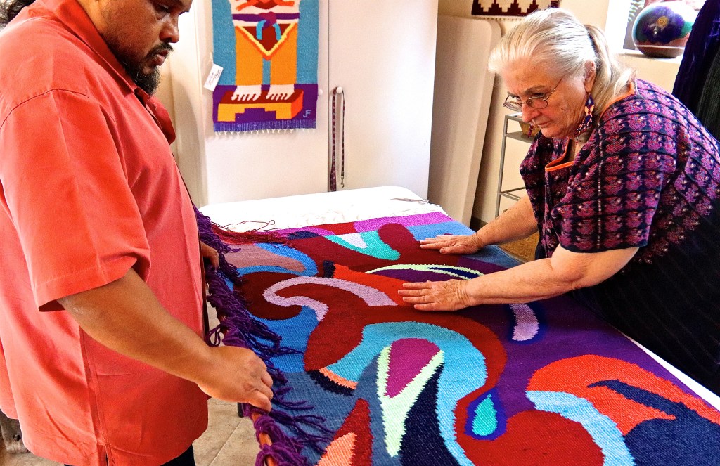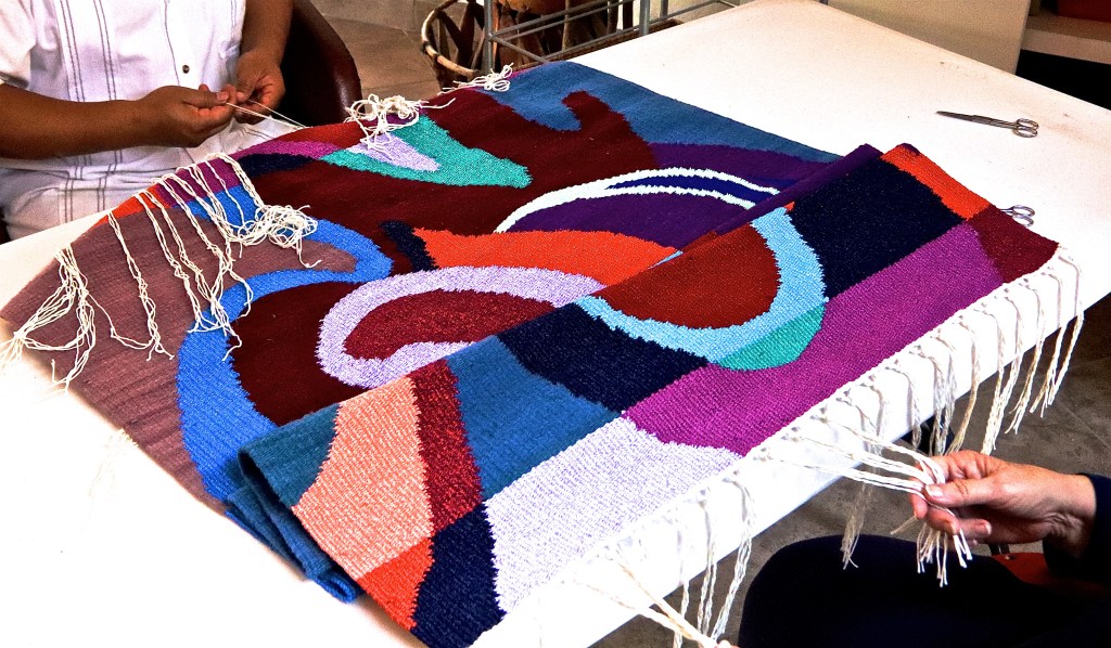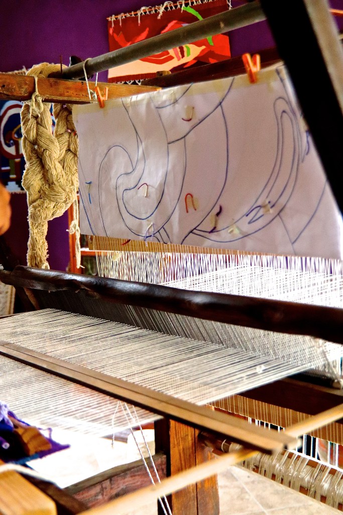 Janice Kimball, accomplished abstract artist, and Francisco Urzua, master Mexican weaver, are a very unusual team. I have felt privileged to be in their presence photographing while they co-create what could be the beginning of a New Wave in Mexican weaving. The fact that Francisco can turn Janice’s very non-traditional, free-form designs into stunning works of abstract fabric art on ancient looms confounds me. Watching him is akin to hearing a very talented jazz musician transform a traditional melody into something familiar and yet utterly new. They are masters of rhythm, in execution and visual results, collaborating at a level at which they become one creator.