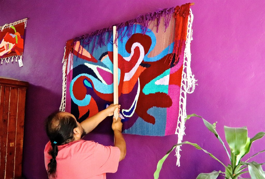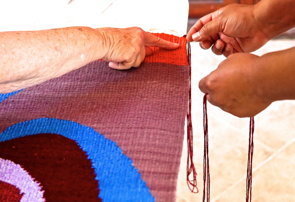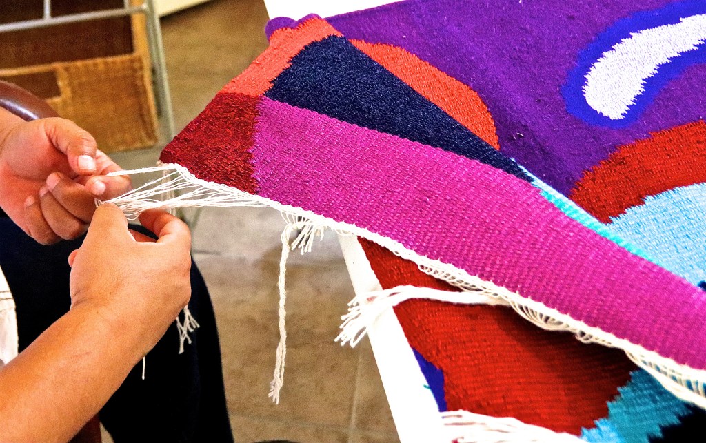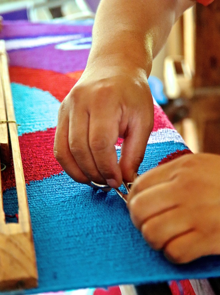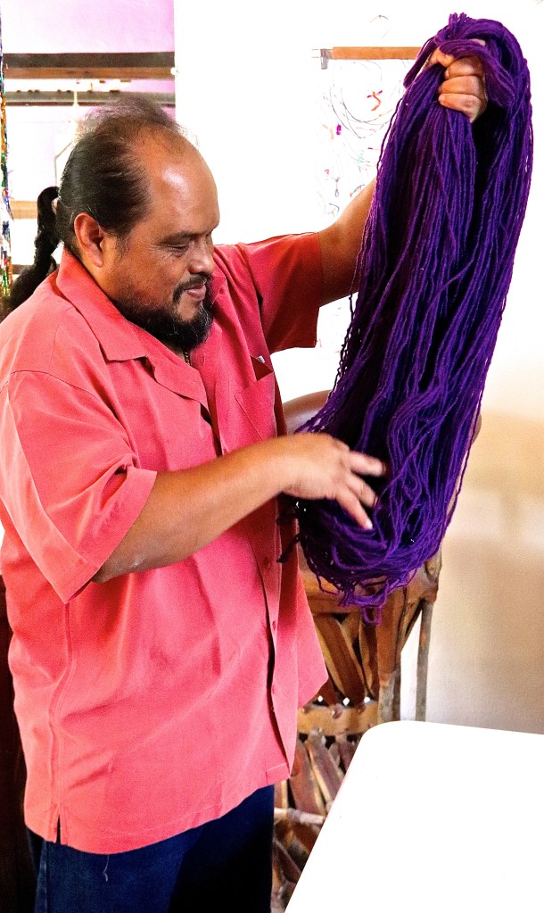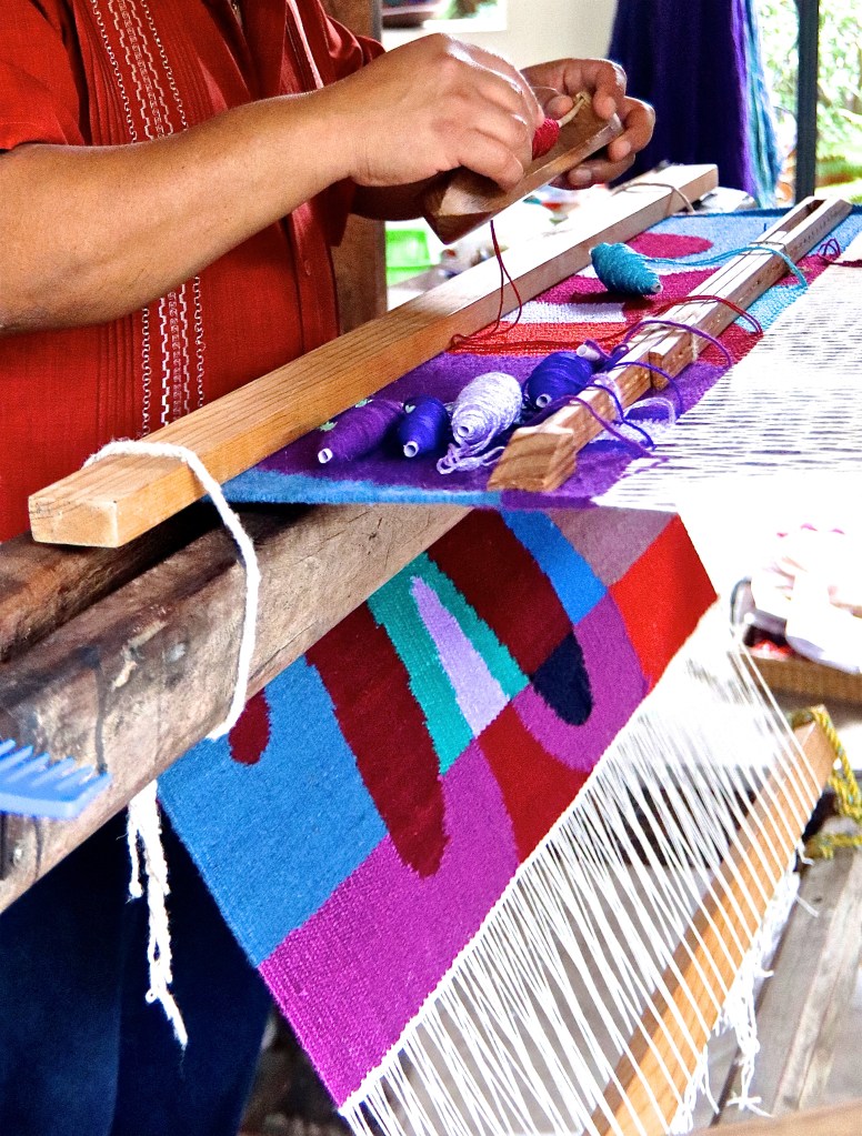 Janice Kimball, accomplished abstract artist, and Francisco Urzua, master Mexican weaver, are a very unusual team. I have felt privileged to be in their presence photographing while they co-create what could be the beginning of a New Wave in Mexican weaving. The fact that Francisco can turn Janice’s very non-traditional, free-form designs into stunning works of abstract fabric art on ancient looms confounds me. Watching him is akin to hearing a very talented jazz musician transform a traditional melody into something familiar and yet utterly new. They are masters of rhythm, in execution and visual results, collaborating at a level at which they become one creator.