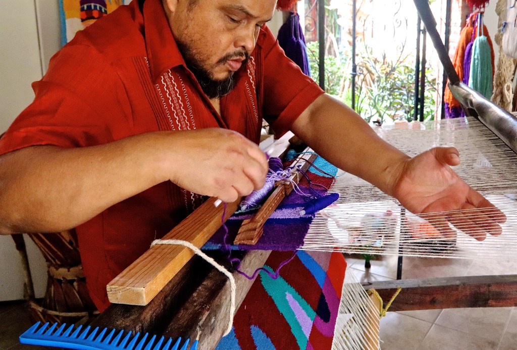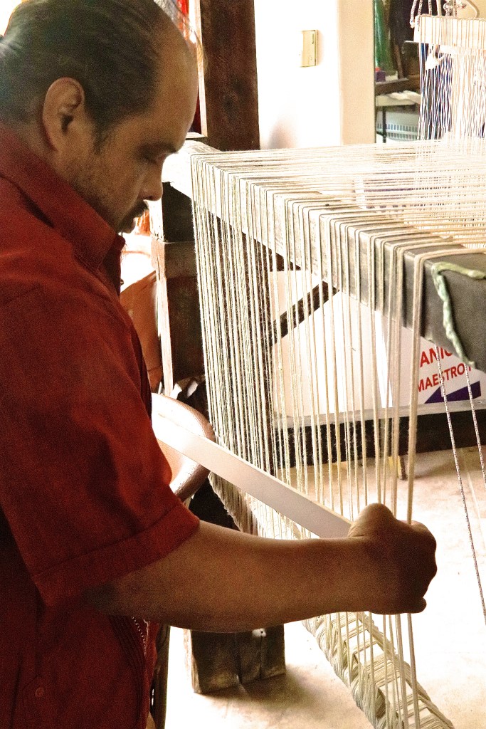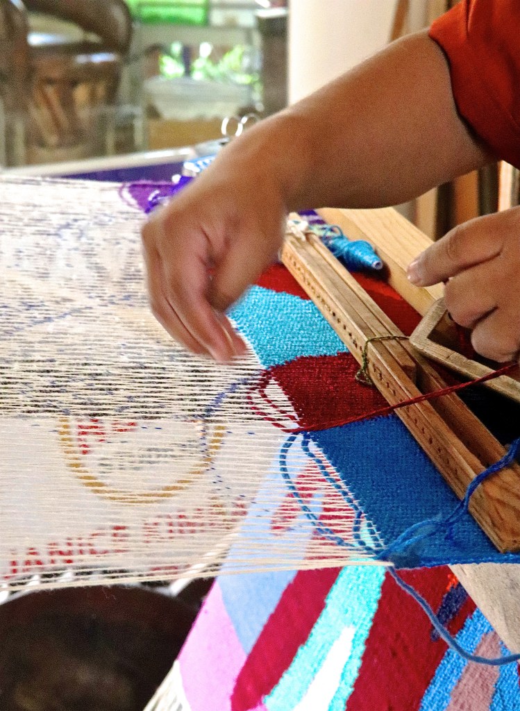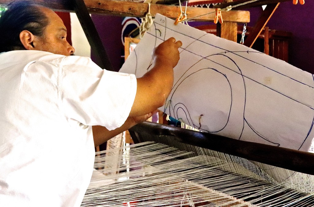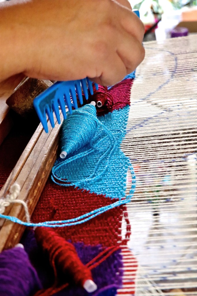 Video is not my accustomed medium, and the lighting was challenging, but it was necessary in order to capture the simultaneous use of both Francisco’s hands and feet as he transforms the design into a woven work of art.