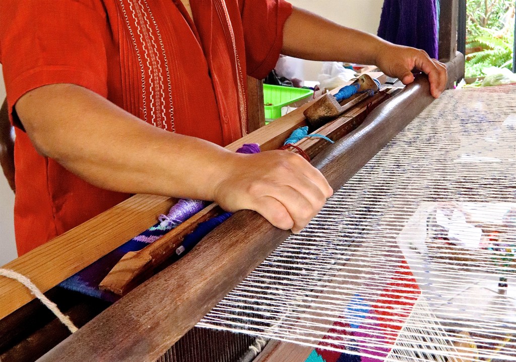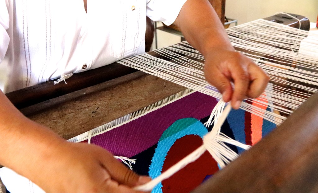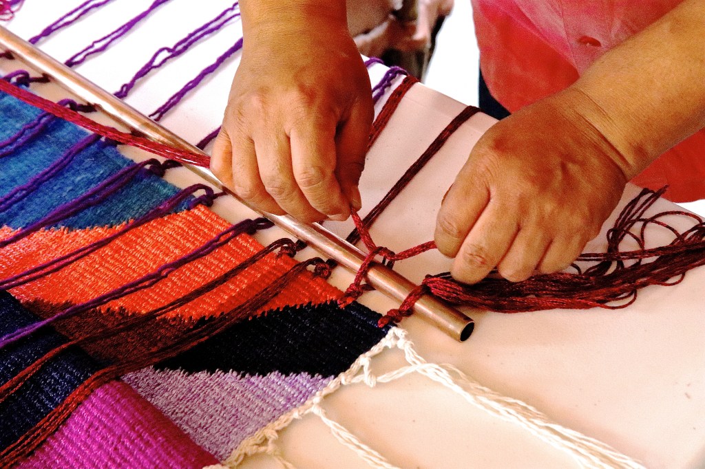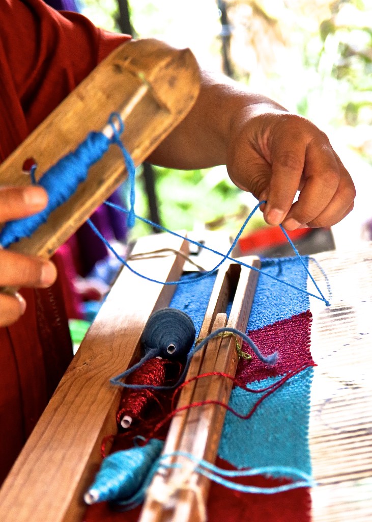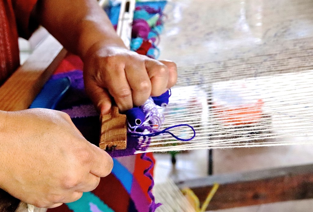 Video is not my accustomed medium, and the lighting was challenging, but it was necessary in order to capture the simultaneous use of both Francisco’s hands and feet as he transforms the design into a woven work of art.