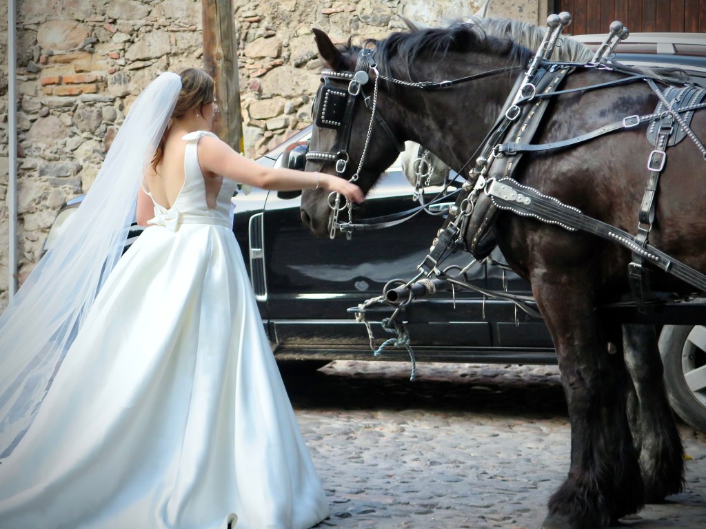 A bride graciously thanks the horses that led her carriage around town after the ceremony